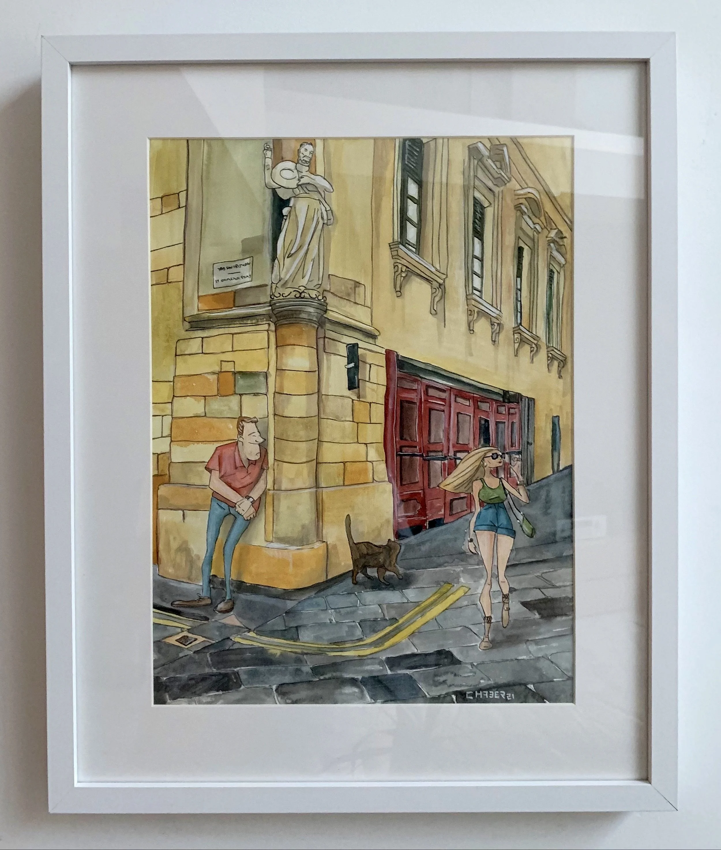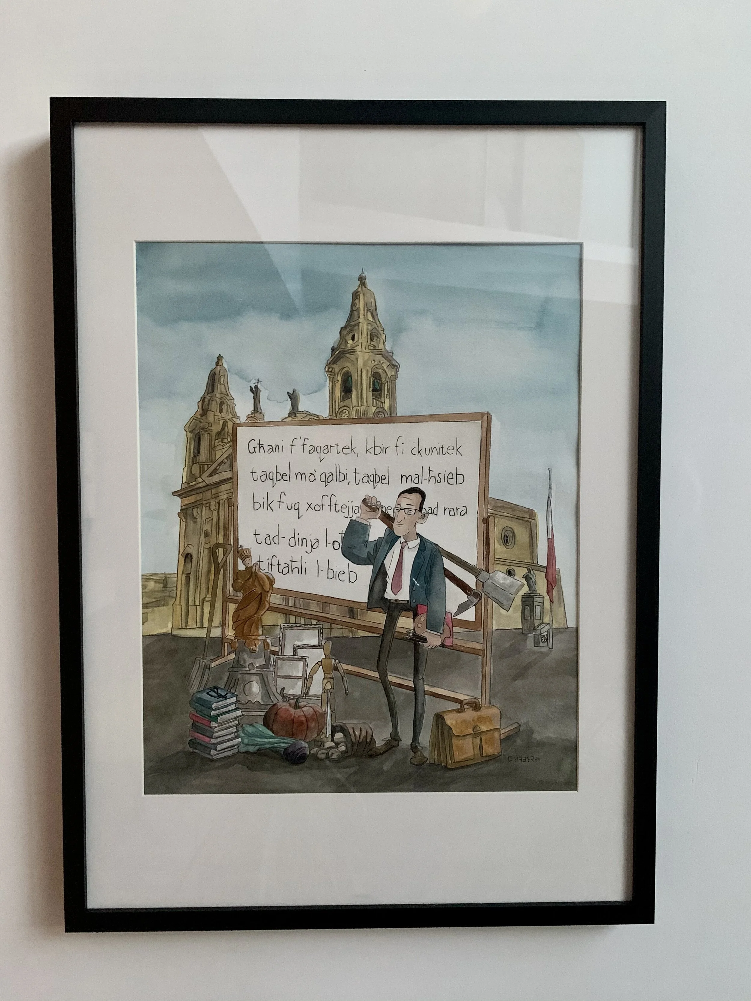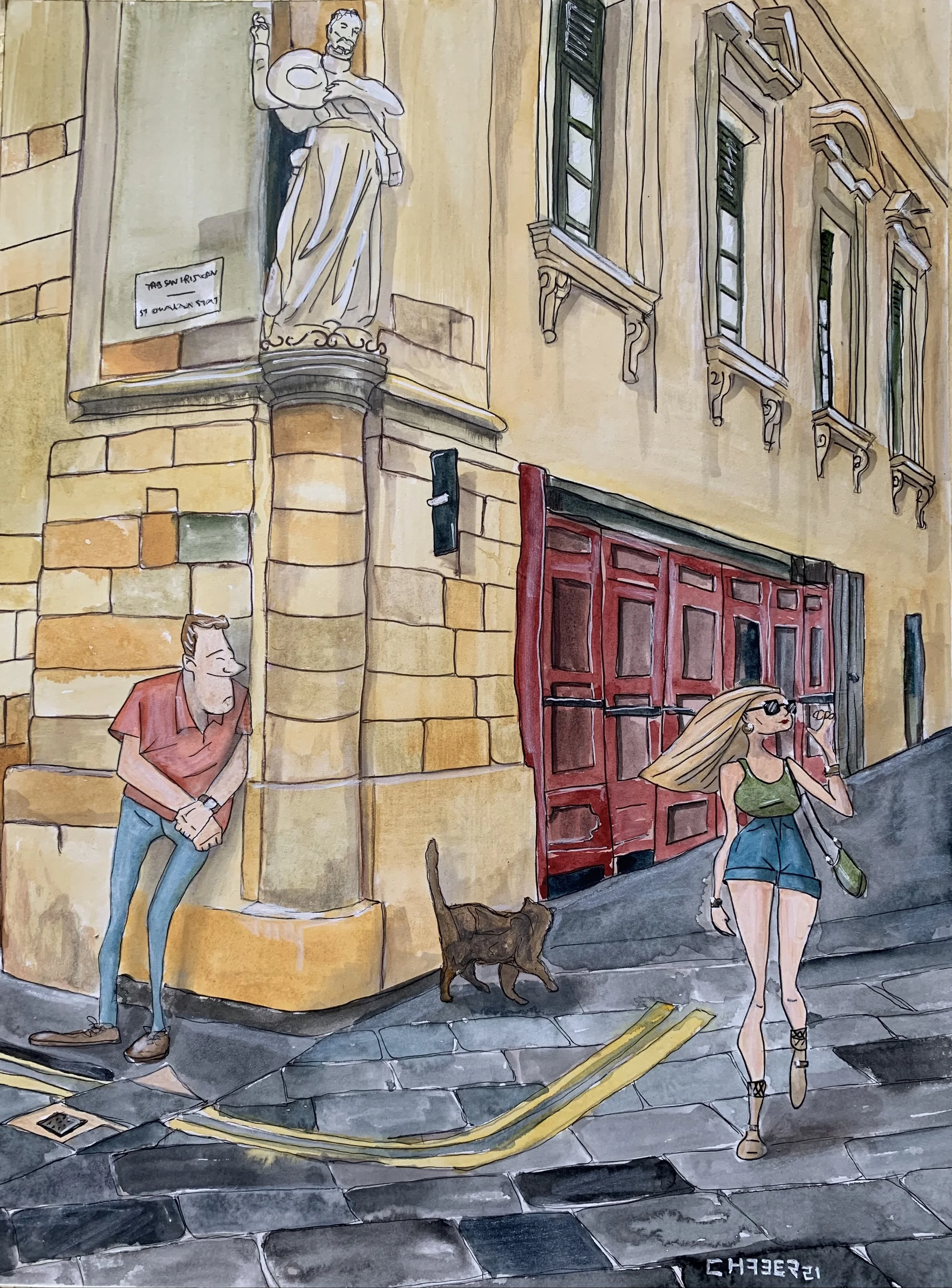 This monument is a tribute to one of the prominent grandmasters during the period where Malta was under the knights, the person that had a vision, the person that decided to build the city and thus its name…Valletta. In this painting we see 2 typical generic persons, two avatars of tourists visiting the place in the scorching sun of a Maltese afternoon. We see one of the persons interested about the story and making reference to her document, whilst the other person is happily munching her food. We can also see a couple of men in police uniform on duty guarding the Auberge de Castlille where the office of the prime minister is sited and another viewer, roaming around… A typical day in Valletta!