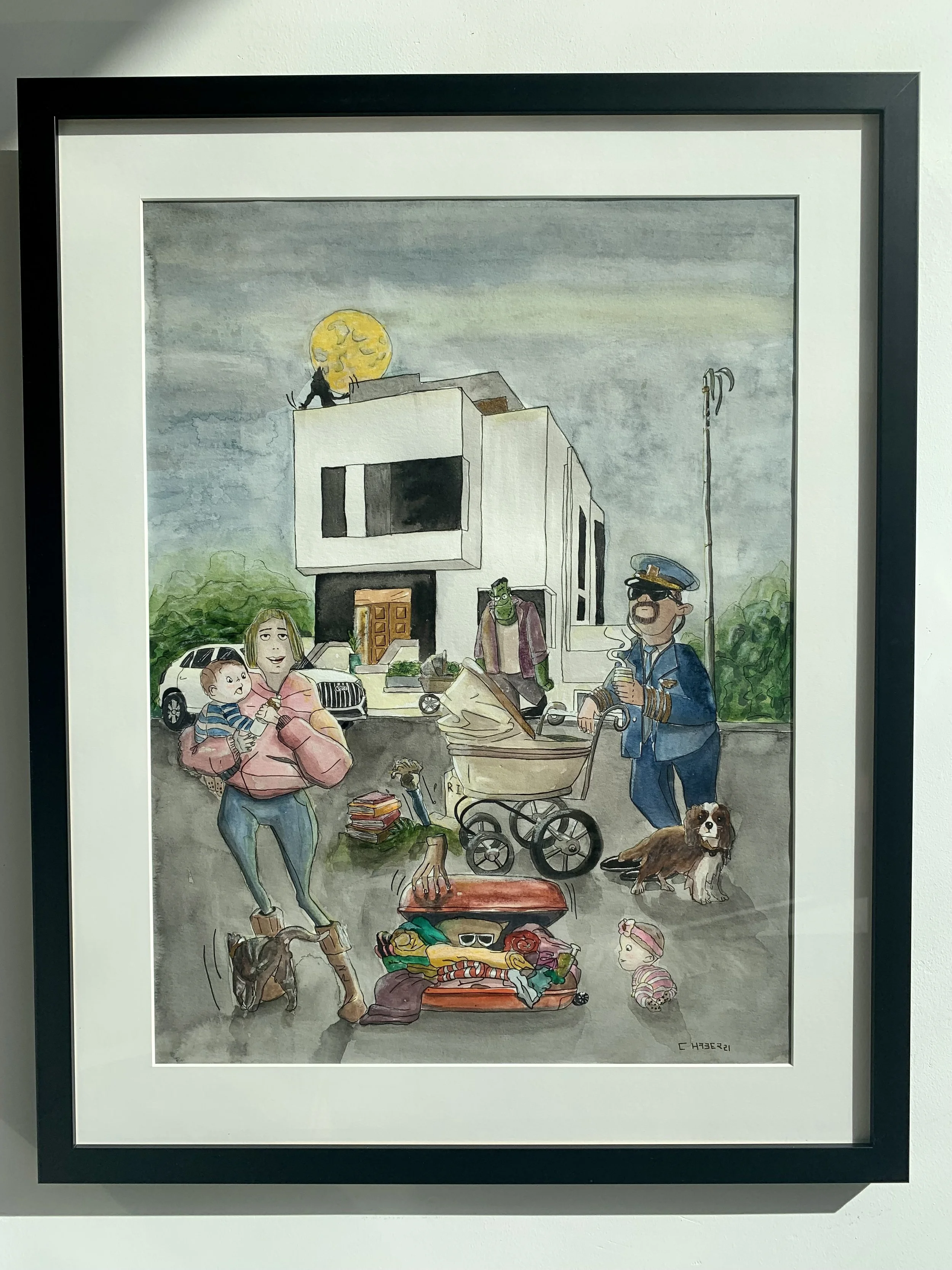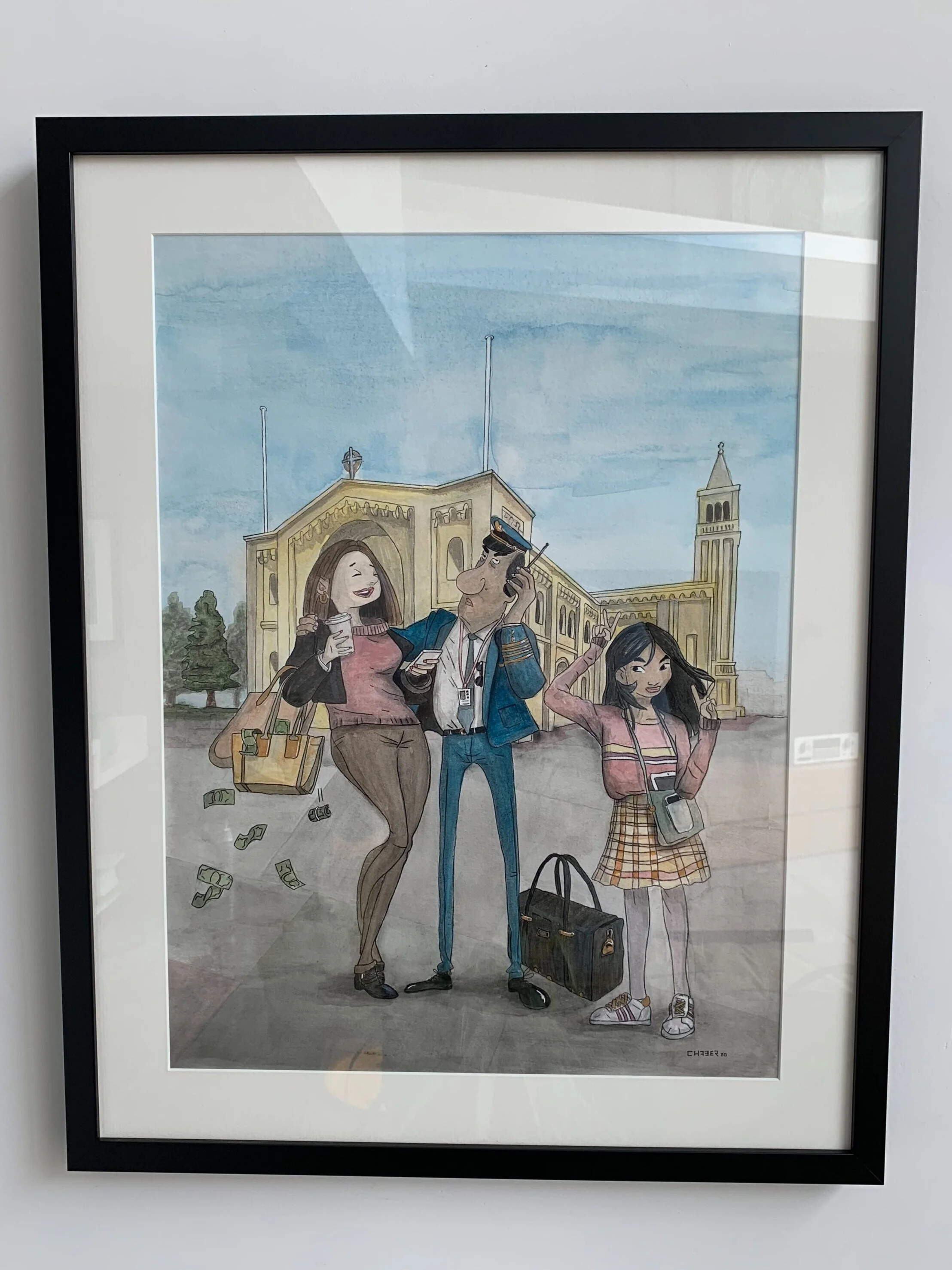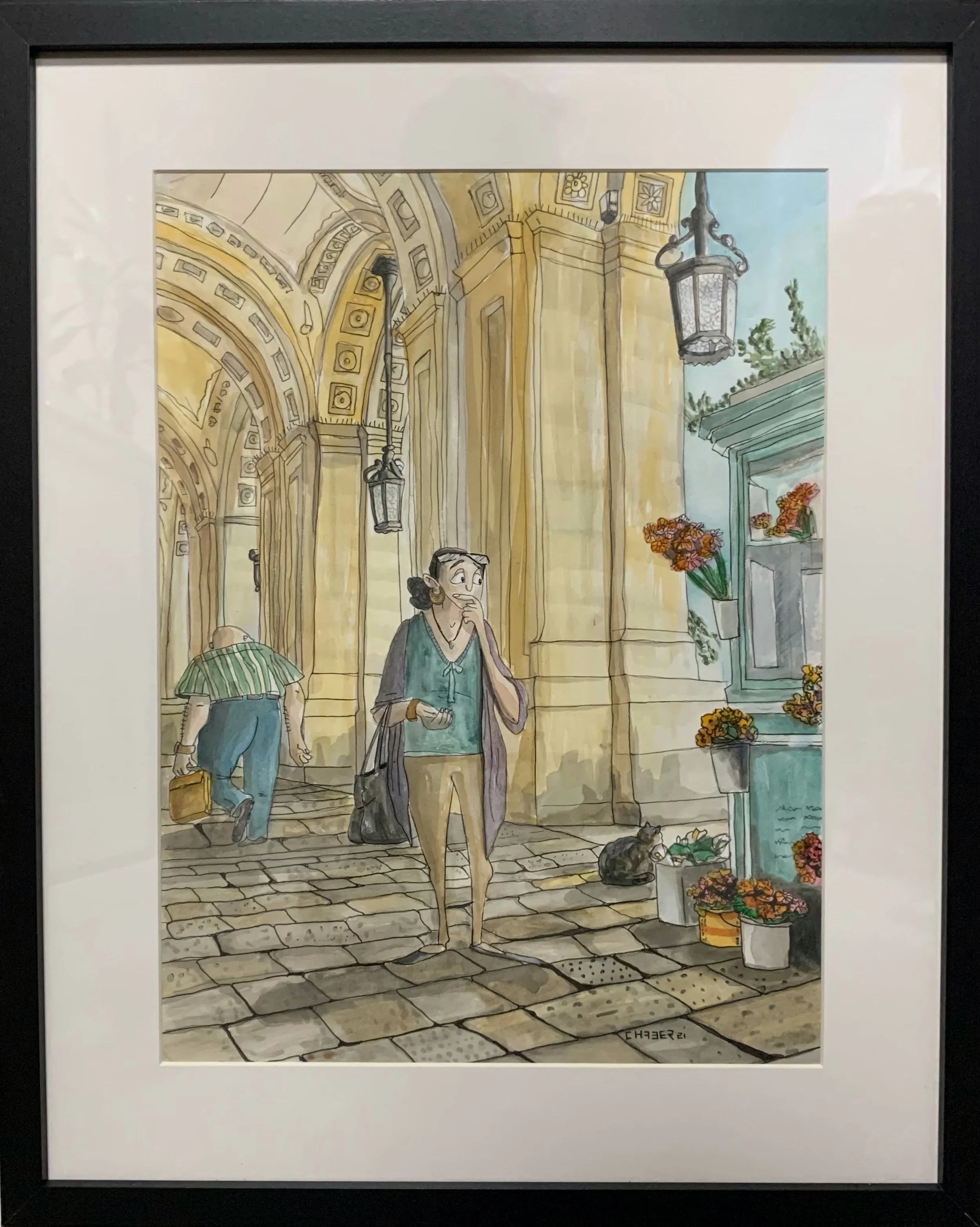 This monument is a tribute to one of the prominent grandmasters during the period where Malta was under the knights, the person that had a vision, the person that decided to build the city and thus its name…Valletta. In this painting we see 2 typical generic persons, two avatars of tourists visiting the place in the scorching sun of a Maltese afternoon. We see one of the persons interested about the story and making reference to her document, whilst the other person is happily munching her food. We can also see a couple of men in police uniform on duty guarding the Auberge de Castlille where the office of the prime minister is sited and another viewer, roaming around… A typical day in Valletta!