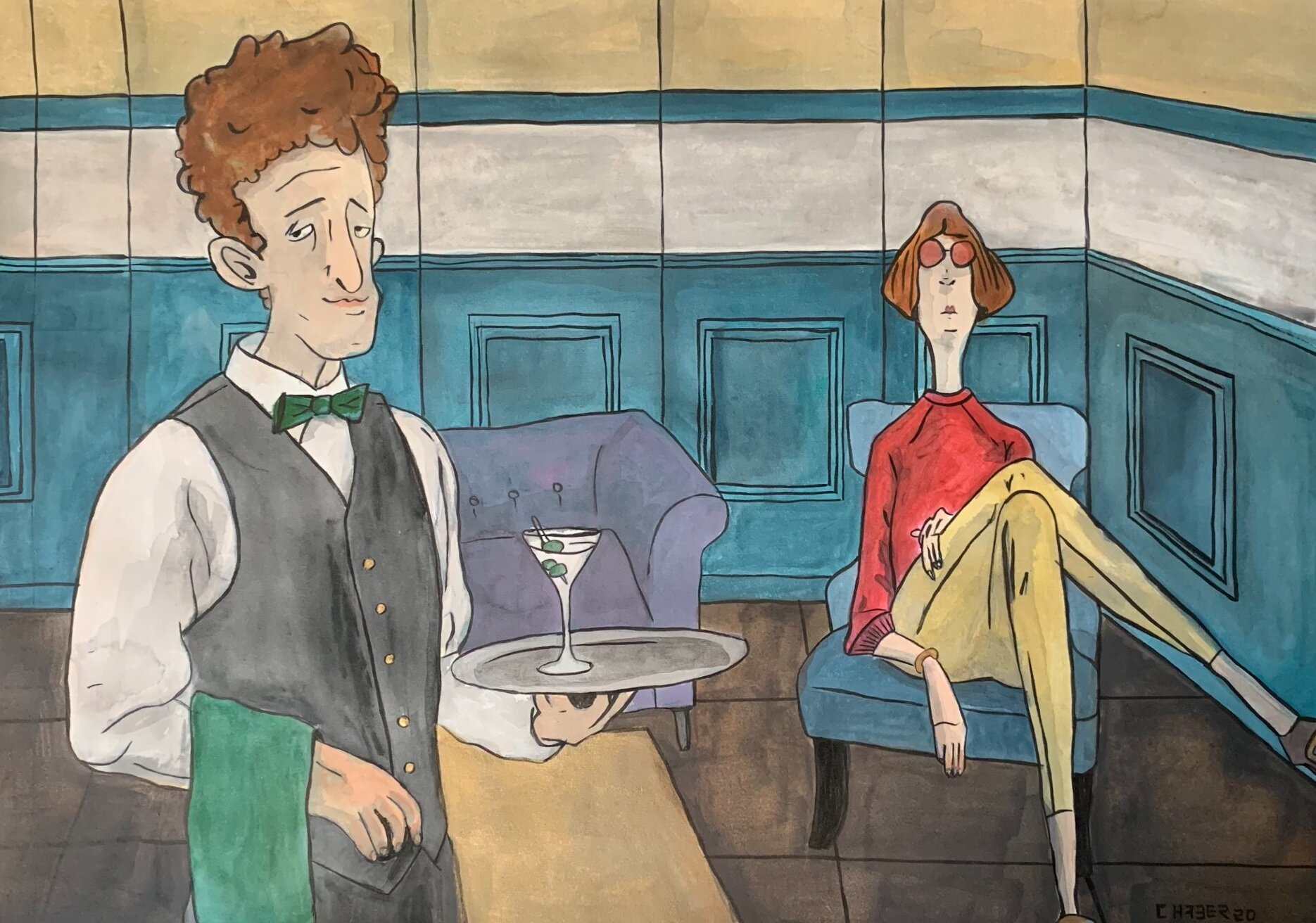 This is a classic scenario where the avatars represent a cheeky, nonchalant waiter Edward serving at his uncle’s hotel and a very demanding, exigent client. How many a time have we encountered either of the sides?! The waiter is almost asking the viewer approval for serving the drink, a dry Martini…Lets hope the Olive will be still in the drink by the time he serves it.