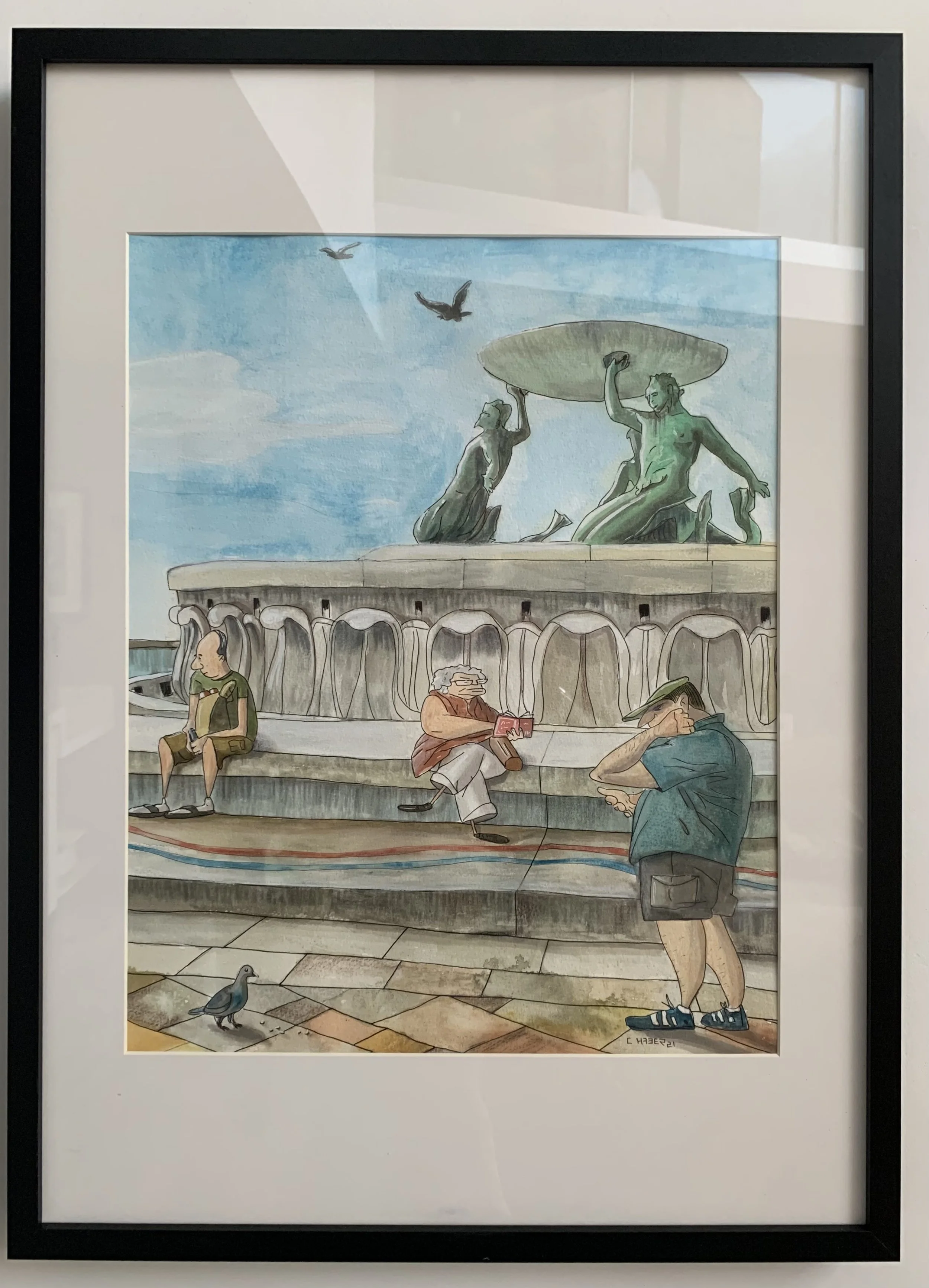 One of the first things one observes approaching Valletta is the Tritoni fountain which is an icon of the Maltese Islands, here depicted in a very casual down to earth manner as it is customary to see people sitting and interacting around the fountain.